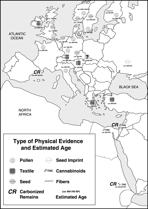 the early range of Cannabis in Europe. Cord and textile scraps as well as